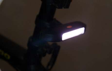 Конструктивно фонарь представляет собой пластиковый корпус с узкой светодиодной COB панелью, прорезиненной кнопкой переключения режимов работы, разъёмом, позволяющим устанавливать фонарь горизонтально или вертикально и, собственно, крепления на подседельный штырь– выполненного в виде резинового ремешка с перфорацией и крючком. Шарнир на ремешке позволяет фиксировать фонарь в пяти положениях: центральном и по два вверх-вниз от центрального – удобно для регулировки угла наклона. Фиксация плотная, положение фонаря не должно меняться даже на весьма ухабистой дороге. Питание от двух элементов типоразмера ААА - это было ещё одним решающим фактором (наряду с малым весом прибора – около 40 граммов), поскольку недостатка в аккумуляторах я не испытываю, скорее избыток, поскольку купил и протестировал несколько десятков аккумуляторов разных производителей (см. мой тест аккумуляторов и зарядных устройств).
